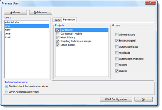 In the Projects panel under the Permission tab, select the check box of a project to which this user is to be assigned.