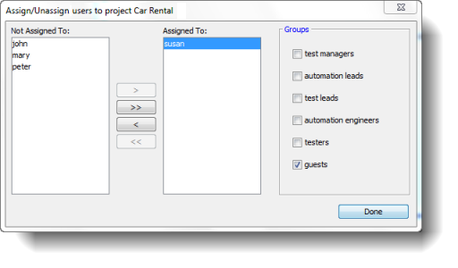 Remember:The group designations you assign here only apply to the current project. They do not affect users’ group memberships within other projects.Note:Note that the administrators group is not available for assignment from this dialog box. That’s because assignment to administrators applies to the entire repository, not just the project. To assign a user to the administrators group, see Assigning projects and permissions to a repository user.Click Done.