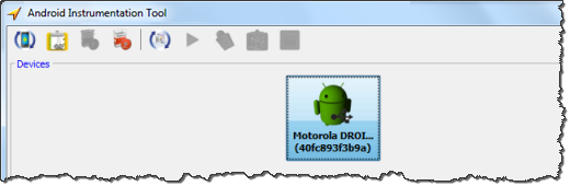 When a new device is connected and detectable, or an old one removed, or an emulator is started or stopped, the change is not registered in the Android Instrumentation Tool dialog box until you refresh the display. Do this by clicking the Refresh devices list