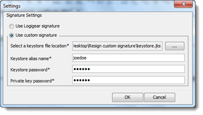 Allowing TestArchitect to test your Android application requires that it be re-signed. The easiest approach is to allow the application to be re-signed with a special LogiGear certificate. Alternatively, you can have TestArchitect re-sign the application with your own custom certificate, but it must be configured correctly.