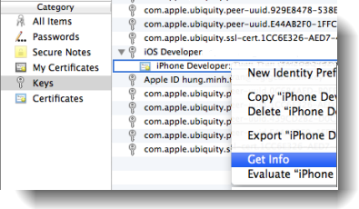 If you need to export the development private key from another test machine, select Applications > Utilities > Keychain Access. In the Keychain Access window, click login in the Keychains panel, then click Keys in the Category panel. In the Name panel, expand the imported private key node you want to use, right-click the certificate, select Export and save the keychain file.