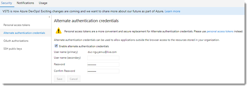 Restriction:authentication access with Personal access tokens and Alternate authentication credentials is supported.Using basic authentication. To do this, you must ’enable alternate authentication credentials’.