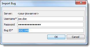 The Import Bug dialog box appears with the default user name and password configured in Registering JIRA server.