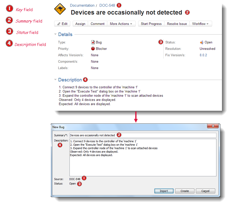 The values obtained from the JIRA bug are loaded into the corresponding Summary, Description, Source and Status fields in the New Bug dialog box.