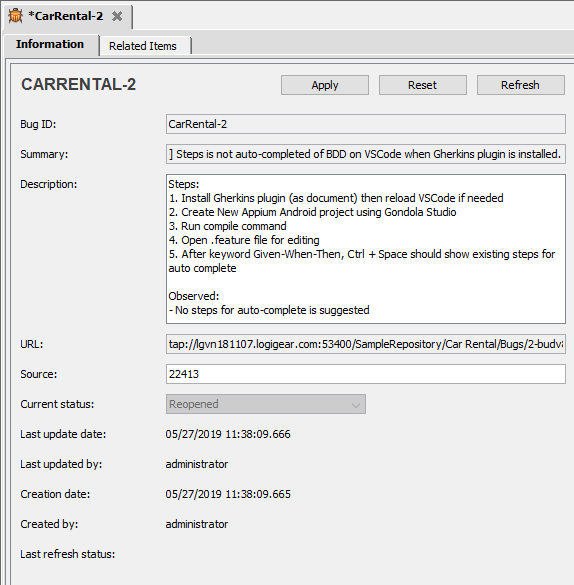 A registered bug is created and appears in the main panel. The fields of the Information tab below are explained in TA bug information.