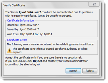 Important:If you have specified HTTPS and the Zephyr server’s identity has not been verified by a trusted third-party, or the SSL certificate installed on your test machine has expired, a Verify Certificate security alert is displayed. To install the SSL certificate, click the Accept button.