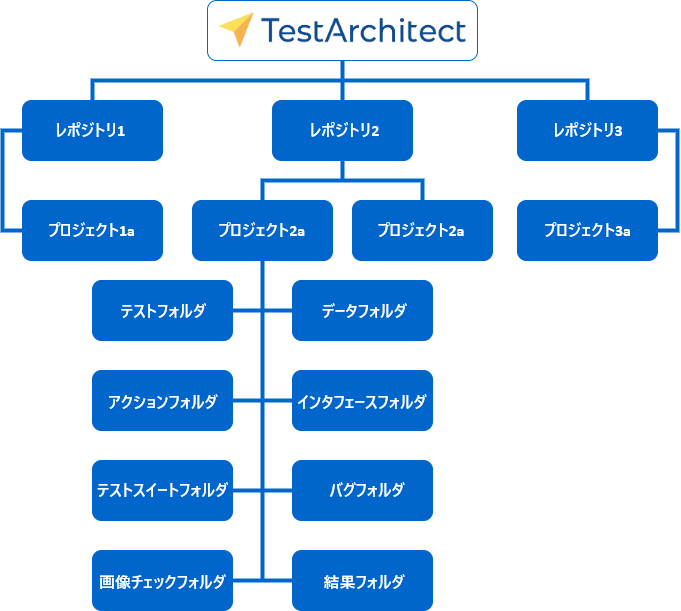 TestArchitectノードの直下には、子ノードがあり、それぞれがリポジトリを表します。各リポジトリには 1 つ以上のプロジェクトがあり、各プロジェクトには TestArchitectの「道具箱」であるアクション、テストモジュール、インタフェース、データセットなどの必須項目が存在します。これらの項目は、TestArchitectプロジェクト項目と呼ばれます。