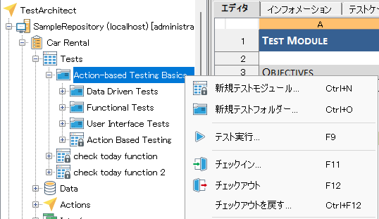 この階層フォルダ構造内の項目はその項目タイプを収容する親ノードのコンテキストメニューから追加されます。例えば、新しいテスト モジュールを追加するには テスト フォルダノードを右クリックし、新しいテストモジュールを選択します。