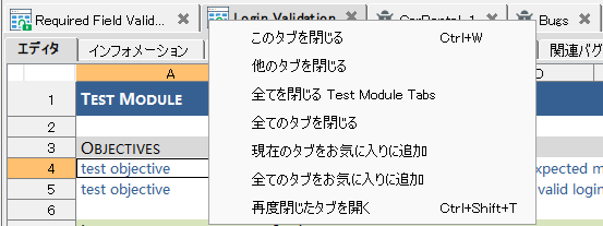 テストモジュールやアクション定義など編集可能な内容を持つ項目を開くと最初のサブタブにエディタでワークシートが表示され、行の追加、削除、修正が可能です。その他のサブタブには、アイテムに関する、またはアイテムに関連する多様な種類の情報が表示されます。