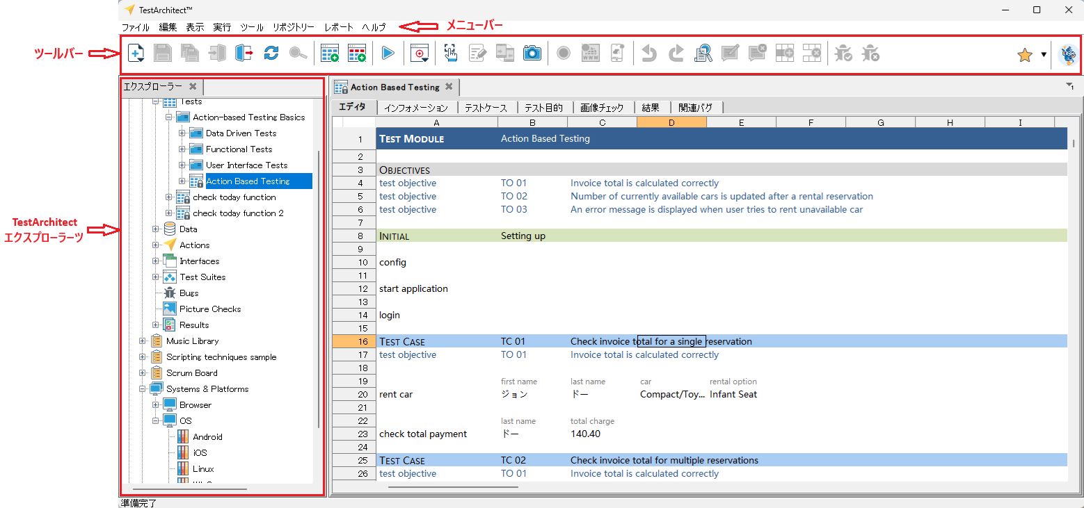 - エディタ: TestArchitectテスト エディタ モジュールのアクション ラインをワークシート形式で表示します。