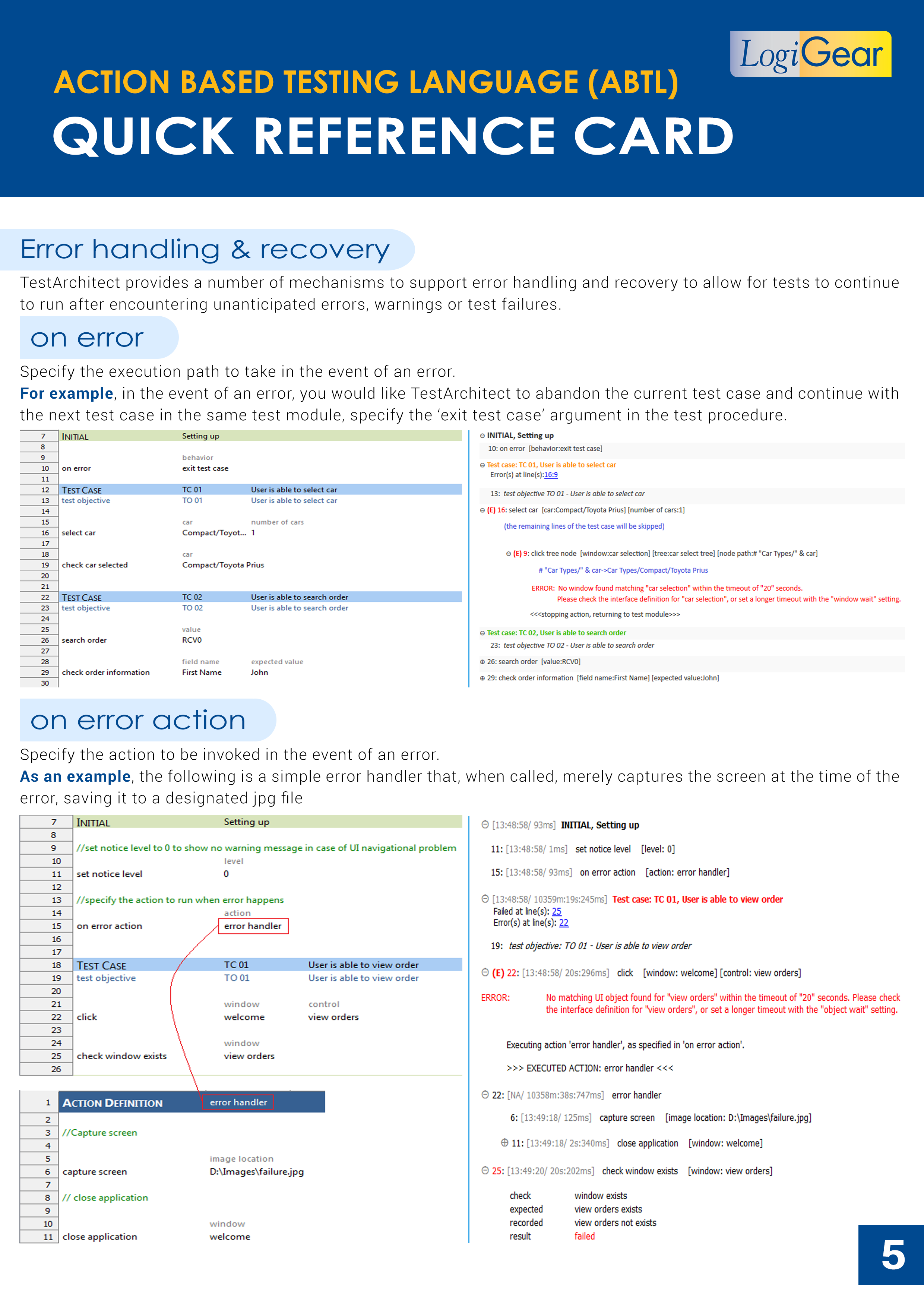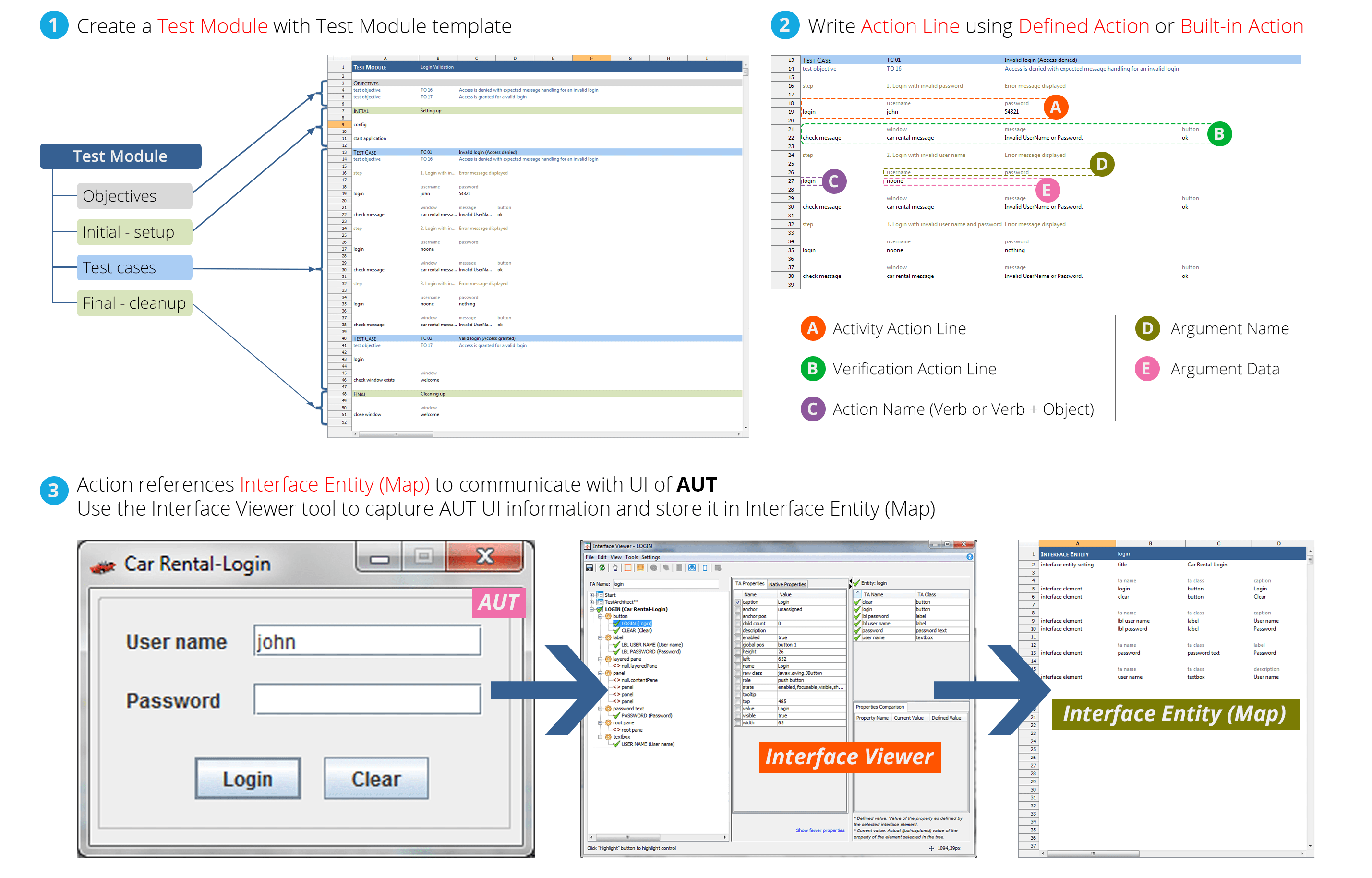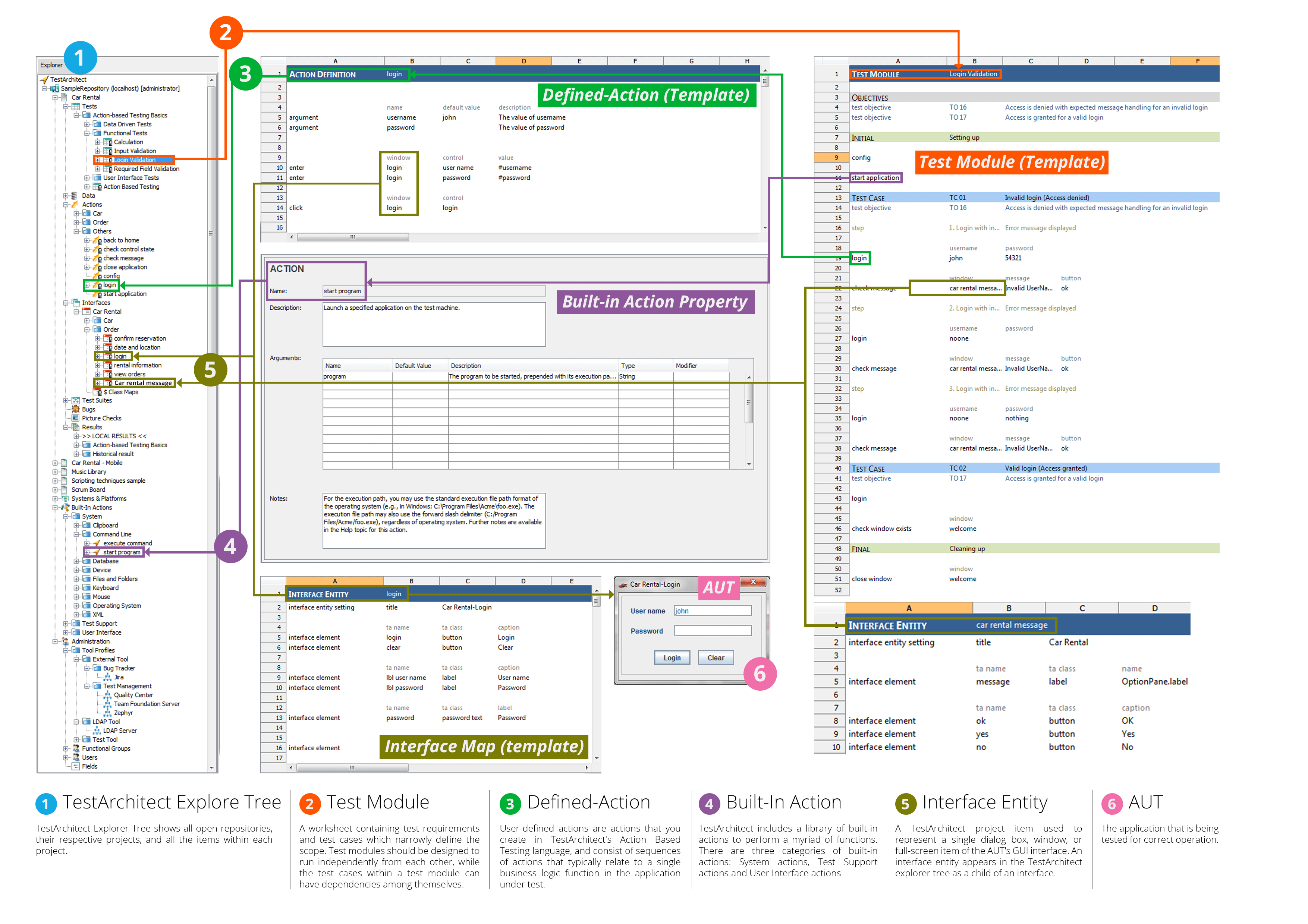 See the diagram below to understand the basics of TestArchitect's project items, the concept of interface mapping (in which user interface objects are identified by their properties), and a quick reference sheet related to Action-Based Testing language.