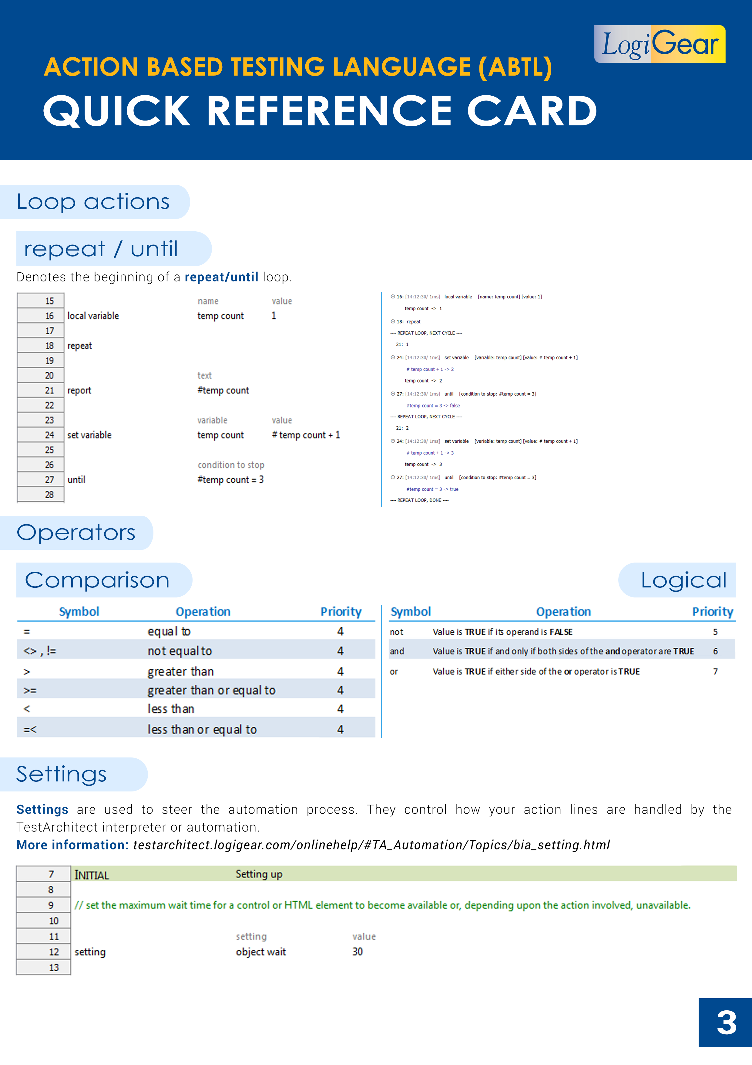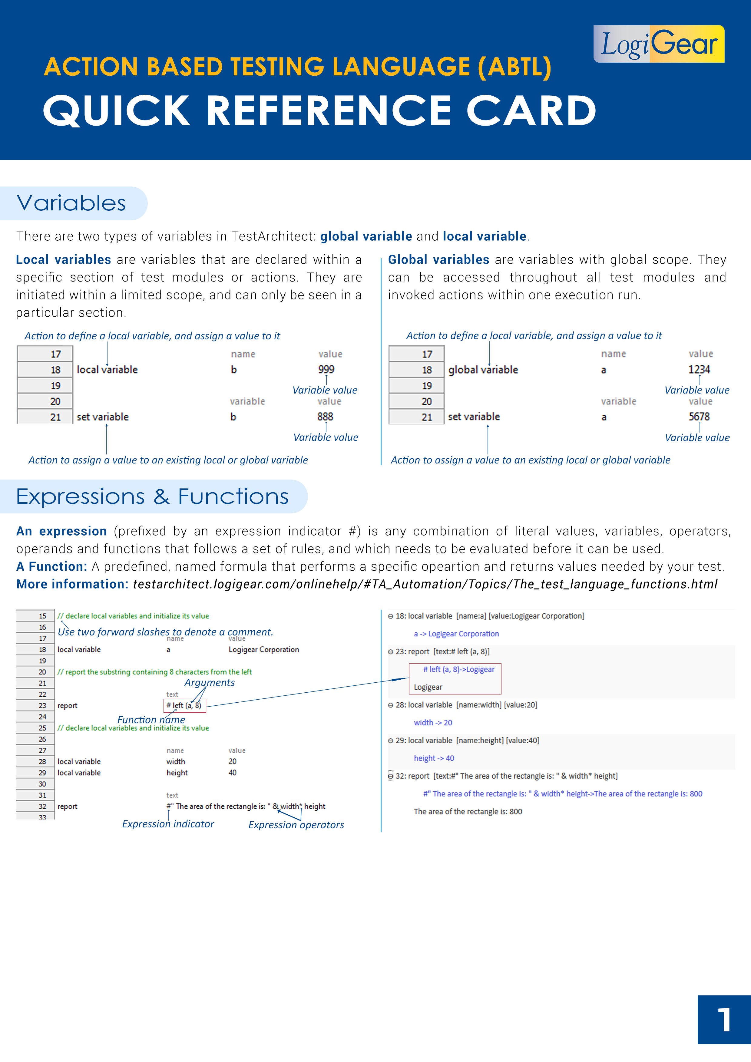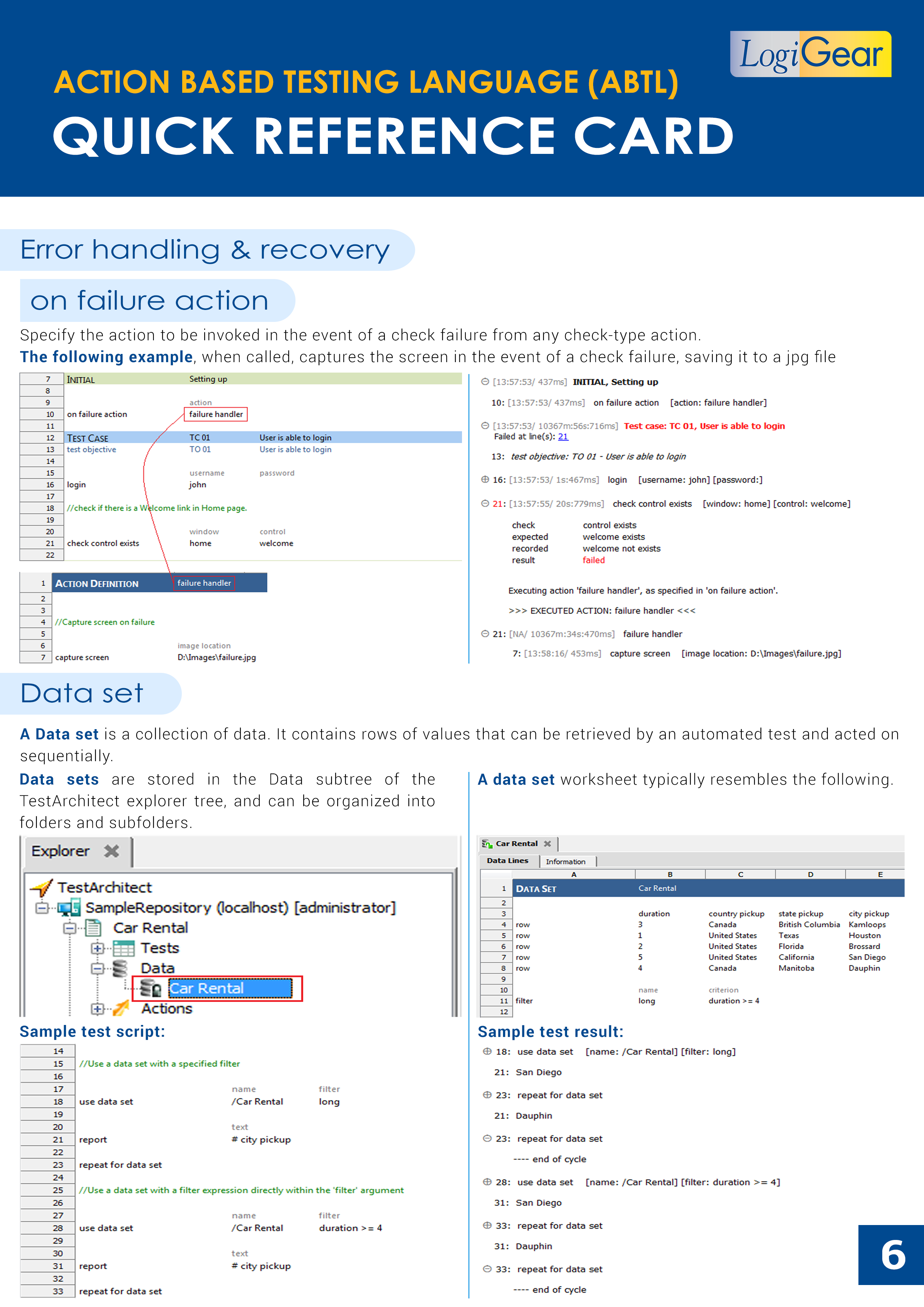 See the diagram below to understand the basics of TestArchitect's project items, the concept of interface mapping (in which user interface objects are identified by their properties), and a quick reference sheet related to Action-Based Testing language.